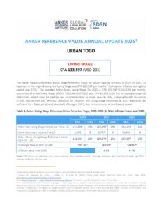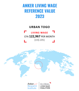 Reference ValueLiving Wage Reference Value for Urban Togo Country: TogoLiving WageCFA133,597Togolese West African CFA Franc per Month= $US 235 per Month2025 EstimateFull Report and Supporting MaterialsUpdate Report2025 Living Wage Reference Value Update - Urban TogoDate: December 12 2025View EnglishUpdate Report2024 Living Wage Reference Value Update - Urban TogoDate: June 01 2024View EnglishReference Value2023 Living Wage Reference Value - Urban TogoDate: July 05 2023View English